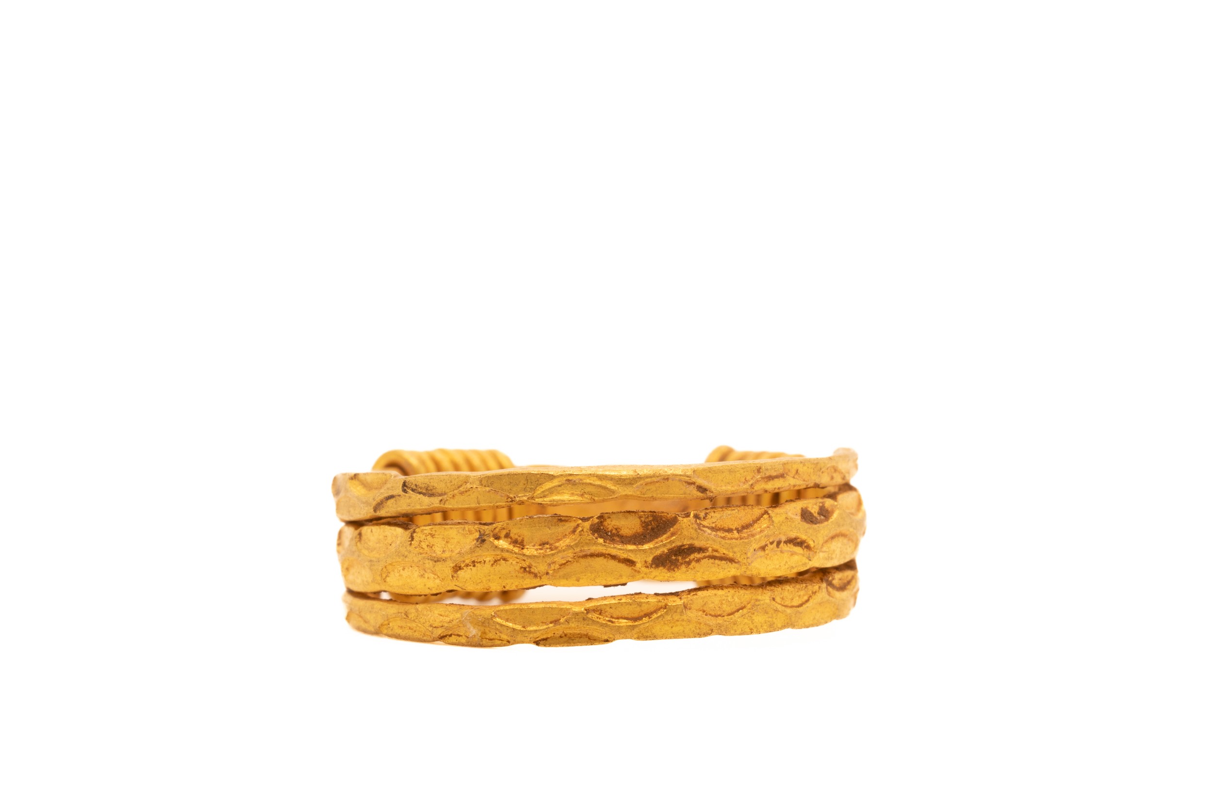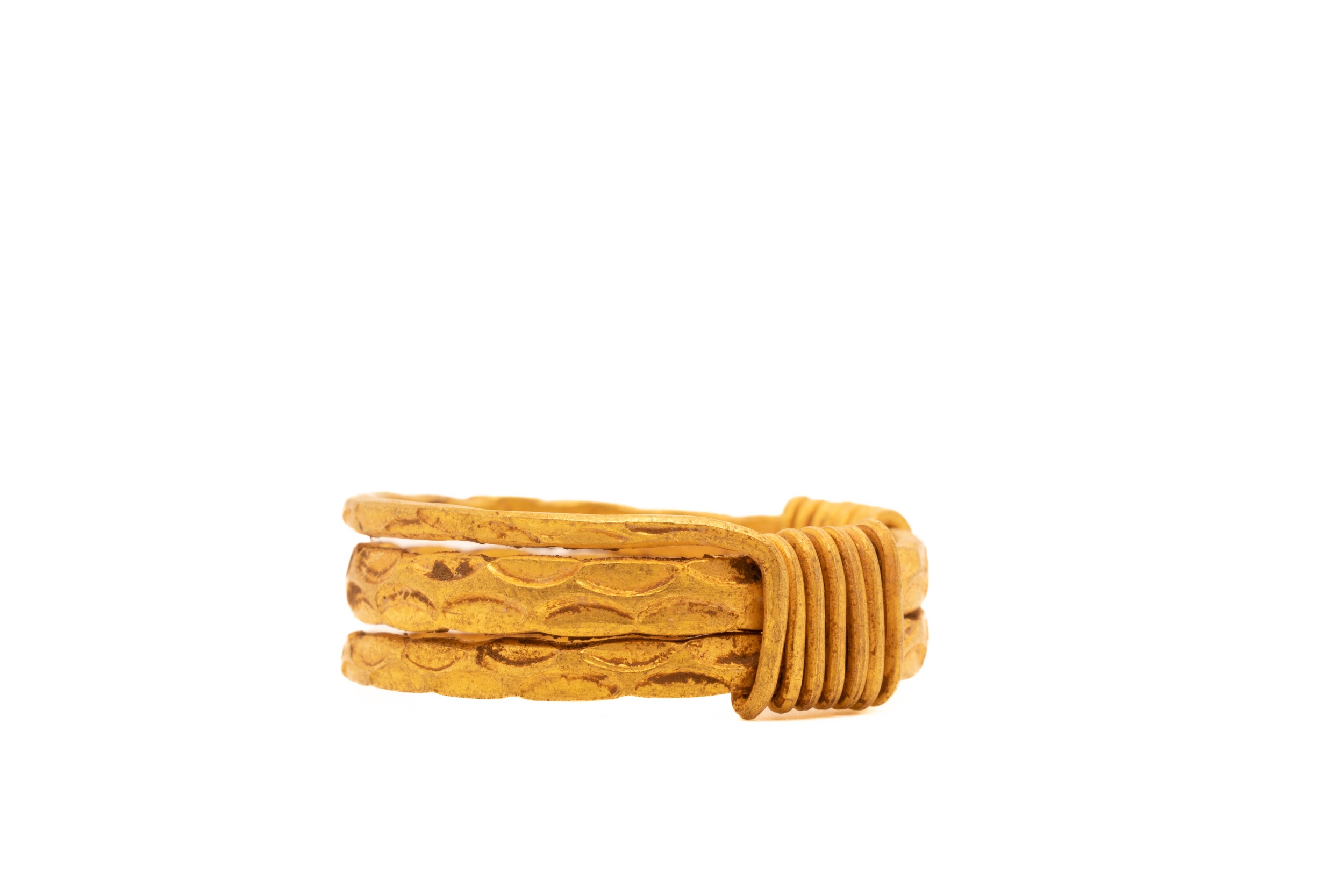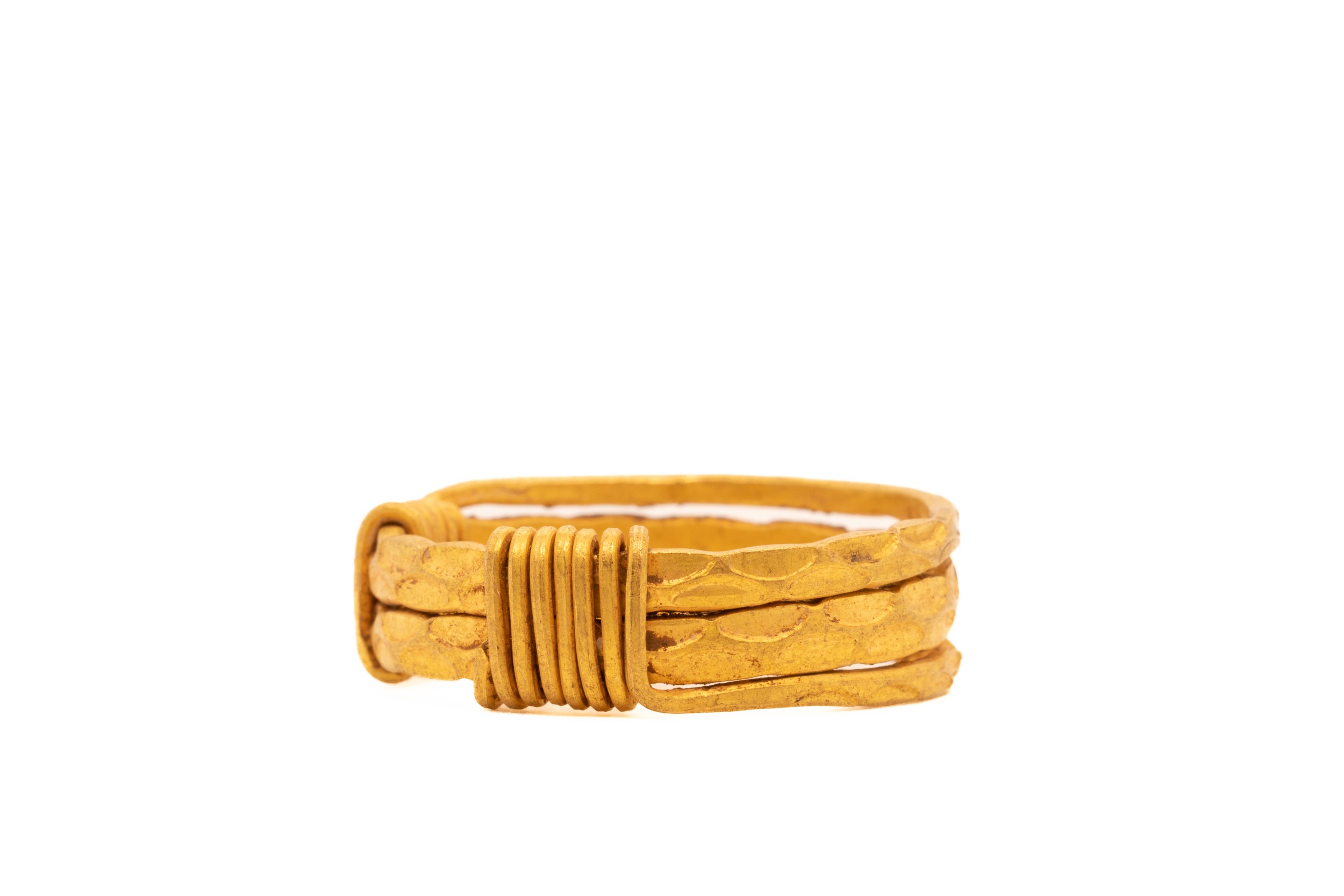 This Viking gold ring features a design with three interwoven bands, secured with coiled wire detailing. The textured bands are formed in a simple yet striking pattern.