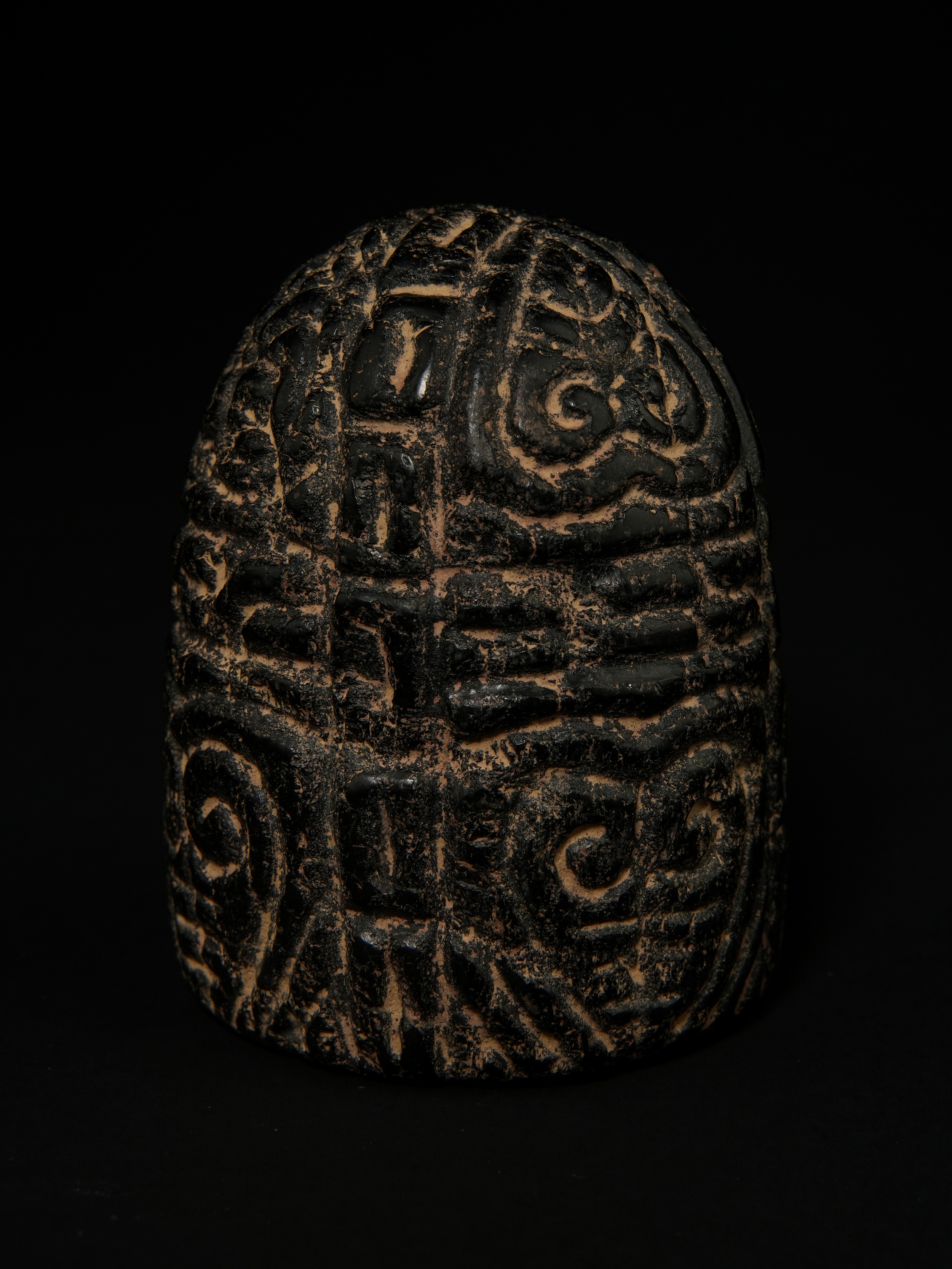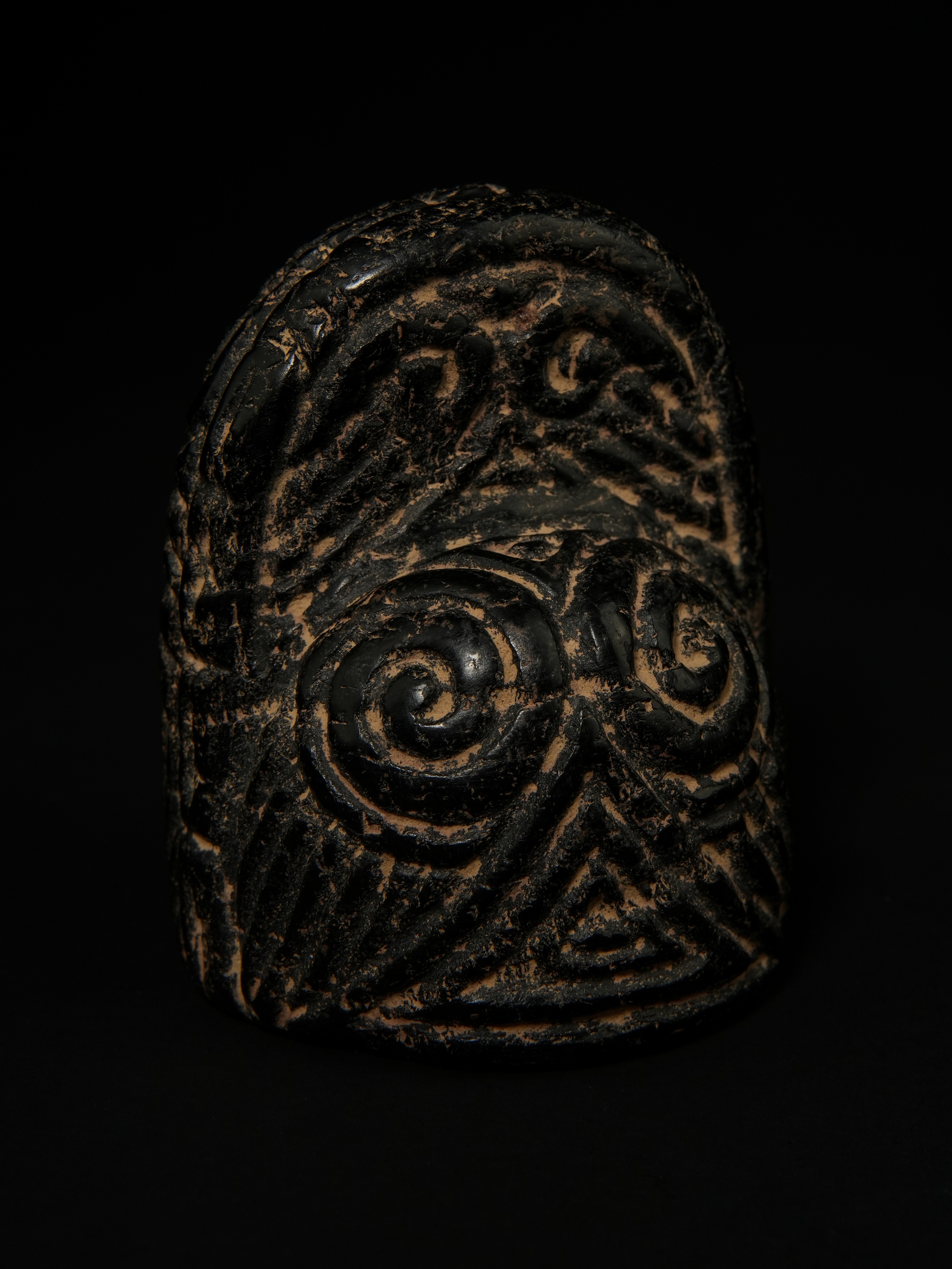 A carved jet chess piece of domed cylindrical form, the surface deeply incised with bold, stylised facial features to the front, including large spiral eyes and a linear beard rendered in rhythmic, curved strokes. The reverse is decorated with dense geometric and abstract motifs, arranged in intersecting bands and scroll-like forms, creating a highly textured surface.