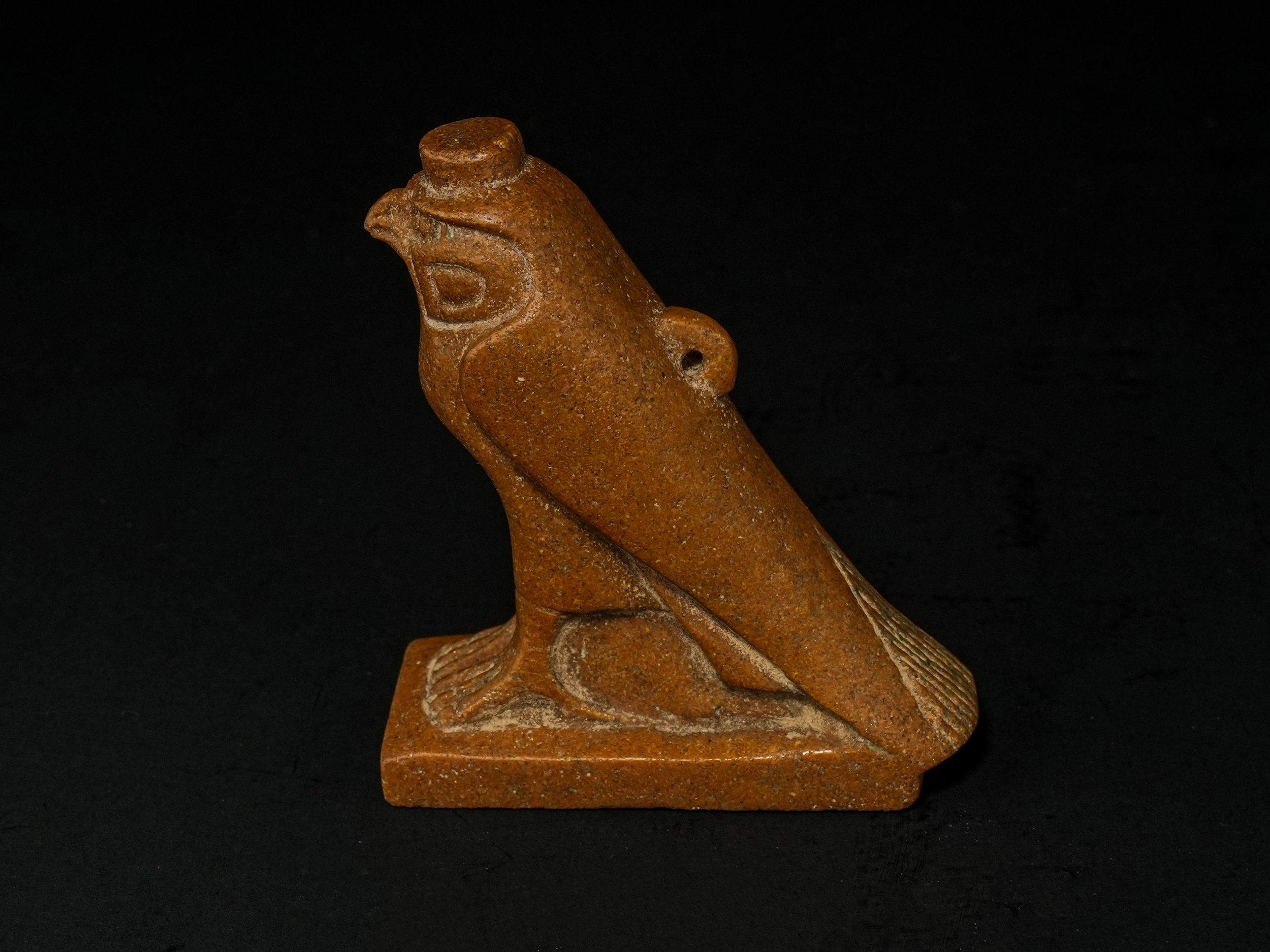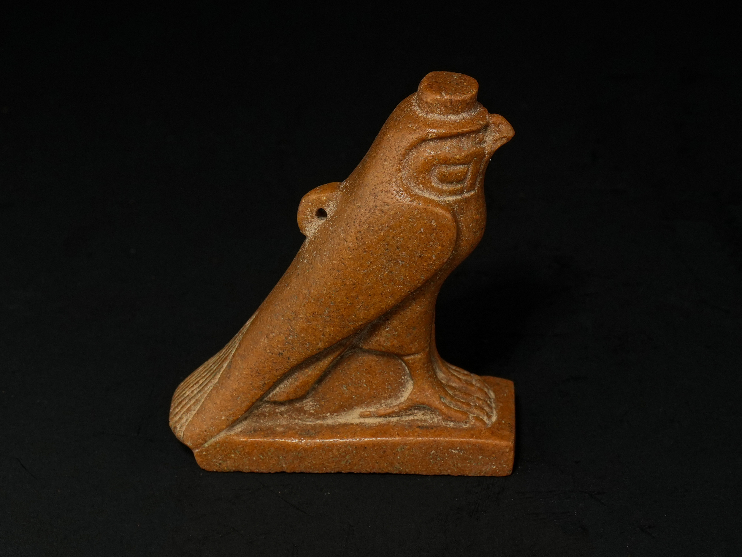 Carved in brown stone, this sculptural figure represents the god Horus in falcon form, shown standing upright on a rectangular plinth. The bird is rendered with a compact, forward-facing posture, its body simplified into smooth, rounded planes contrasted by incised linear detailing to the wings and tail feathers. The head is stylised with a hooked beak, almond-shaped eye, and a flat circular element atop the head, suggestive of a crown or symbolic attribute. A small pierced lug projects from one side of the body, possibly intended for suspension or attachment.