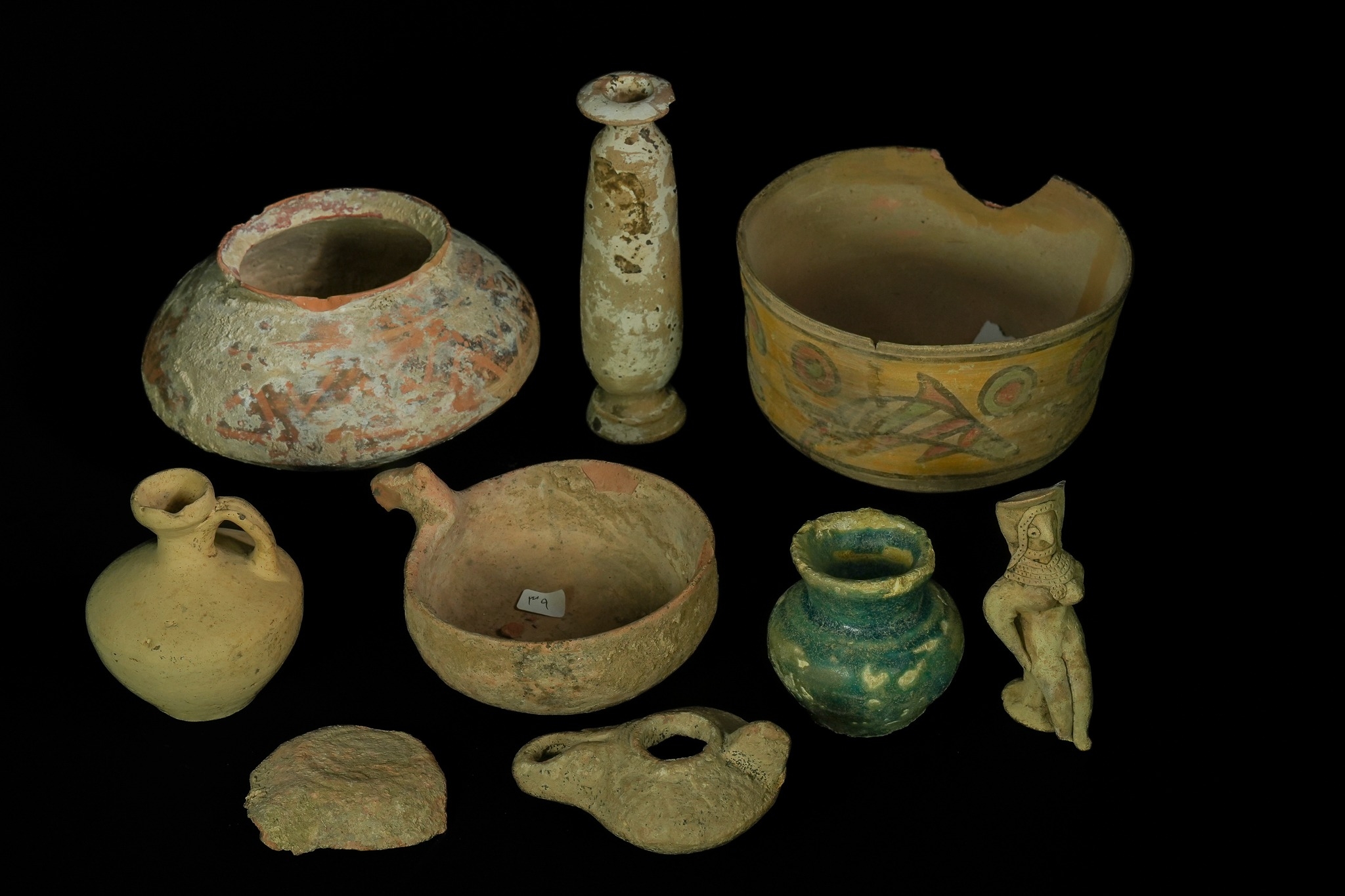 A Mixed Group of Indus Valley Terracotta Vessels, 2nd Millennium BC – A mixed group of nine ancient ceramic artifacts, attributed to the Indus Valley Civilisation and dating to the 2nd Millennium BC. The collection comprises various utilitarian vessels, a figural statuette, an oil lamp-like object, and a pottery shard. Primarily unglazed earthenware or terracotta, the pieces display diverse forms and decorative styles. Some items feature remnants of painted motifs in red, orange, yellow, and green pigments, while one small jar showcases a mottled turquoise-green glaze. Modern inventory numbers, such as "53" and "39," are visible on white adhesive labels on some items.