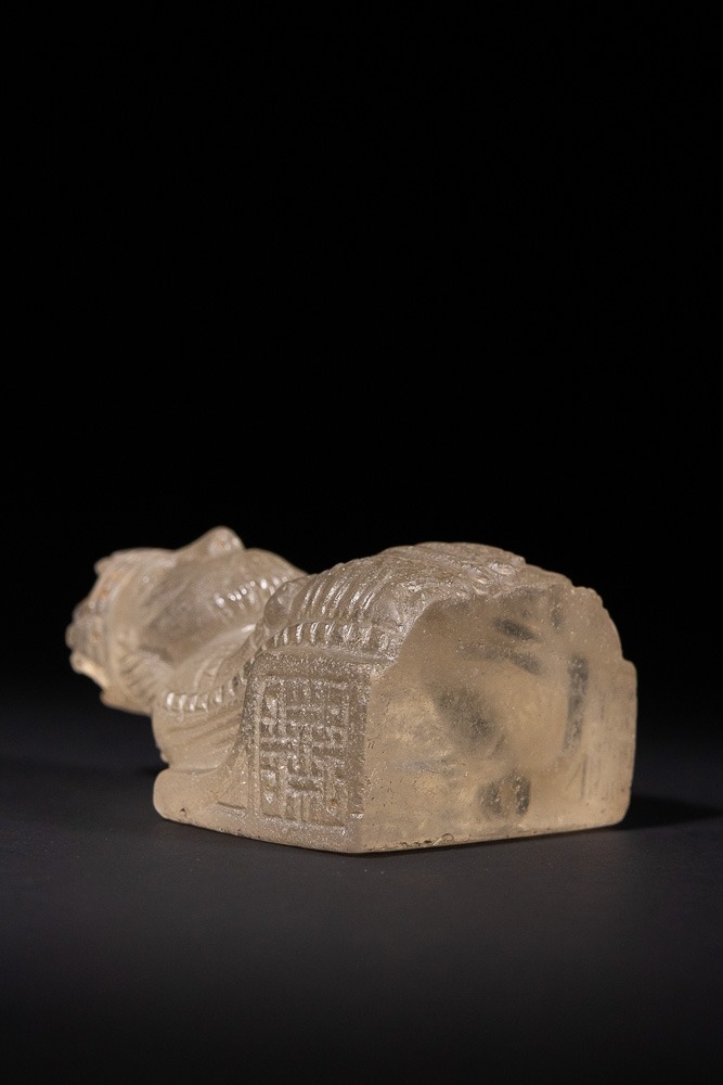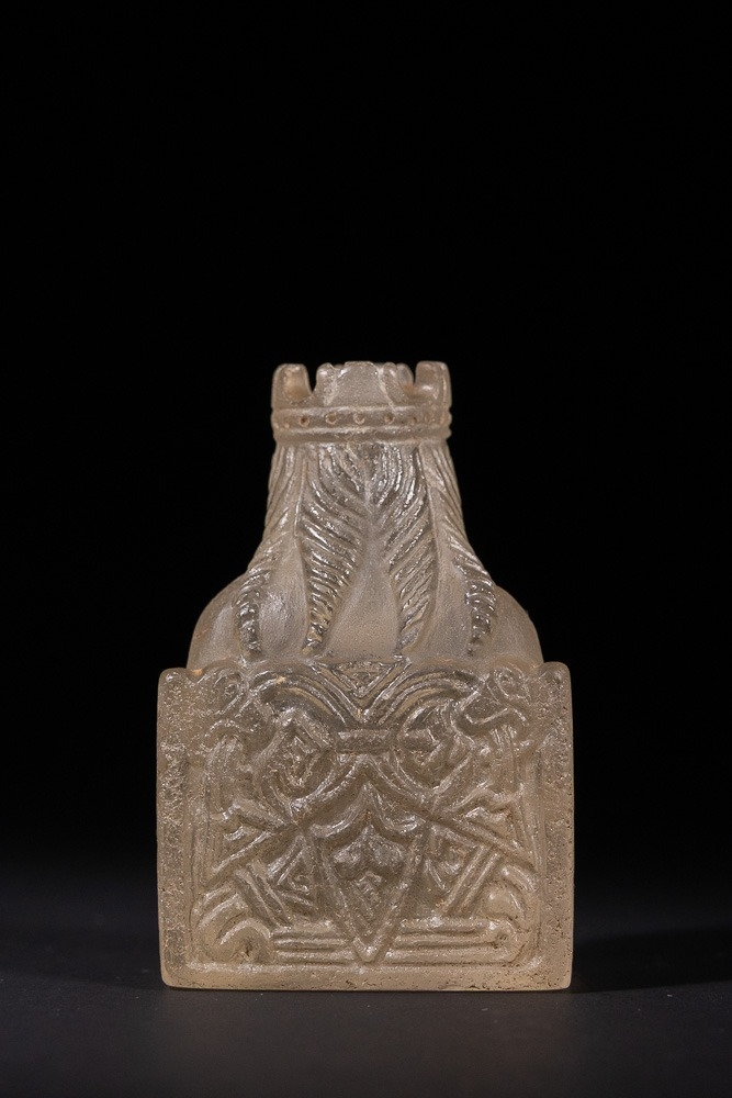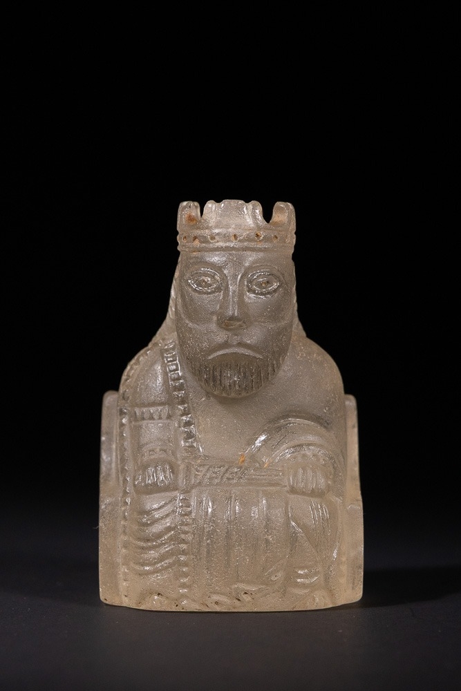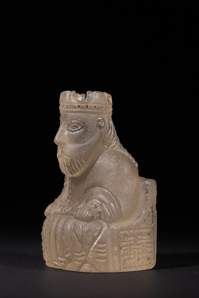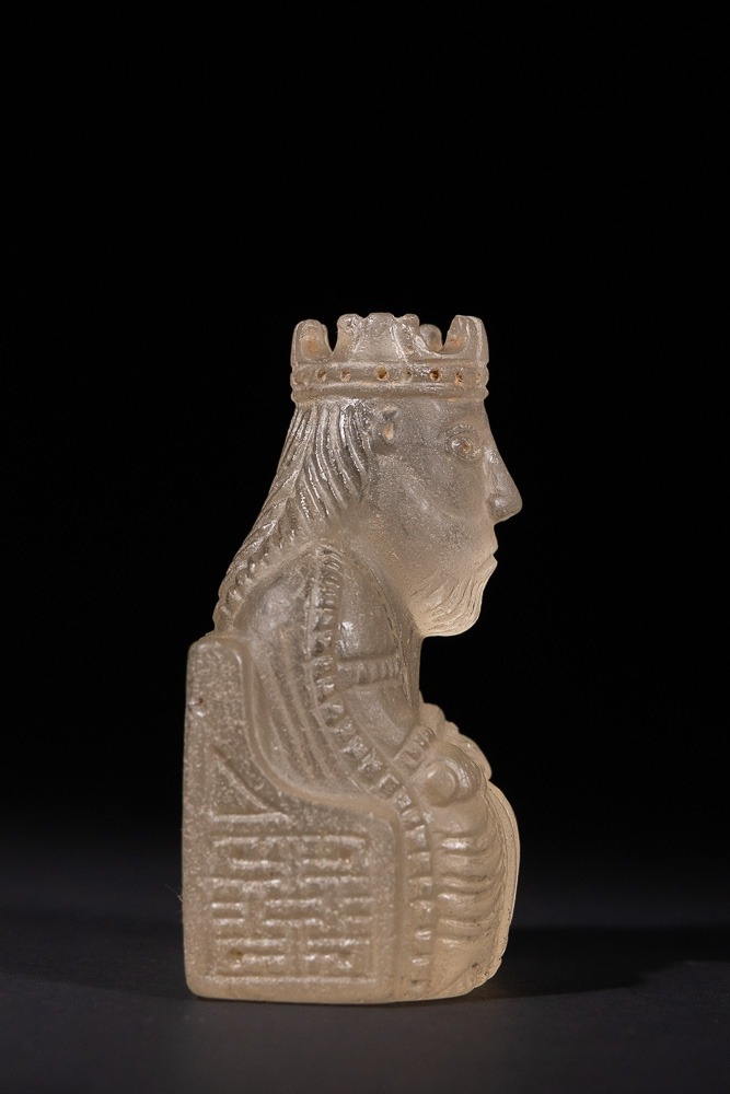 A Medieval Rock Crystal Chess Piece, King, in the Style of the Lewis Chessmen, Late 12th/Early 13th Century – A carved, translucent figure depicting a crowned and bearded male bust, identifiable as a King, fashioned from a light amber-hued, semi-transparent rock crystal. This piece is rendered in the distinctive style of the Lewis Chessmen. The material exhibits internal inclusions and natural variations. The stylized carving features a crenellated crown, almond-shaped eyes, and hands clasped in front, consistent with medieval European design influences. Each side of the piece features a distinct square cartouche with an intricately stylized, angular pattern.